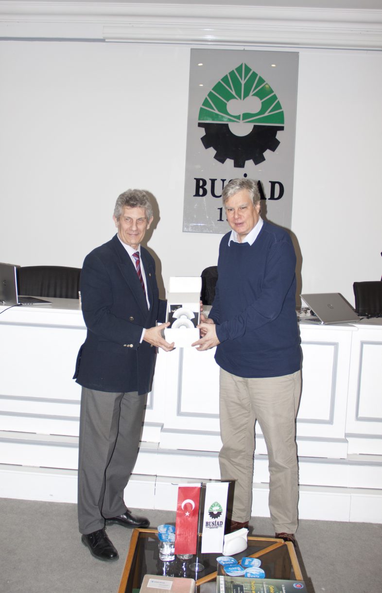 Katılımcıların sorularını da yanıtlayan Prof. Dr. Öymen'e etkinlik sonunda BUSİAD Yönetim Kurulu Başkanı Buğra Küçükkayalar tarafından Derviş Fincan Seti hediye edildi.